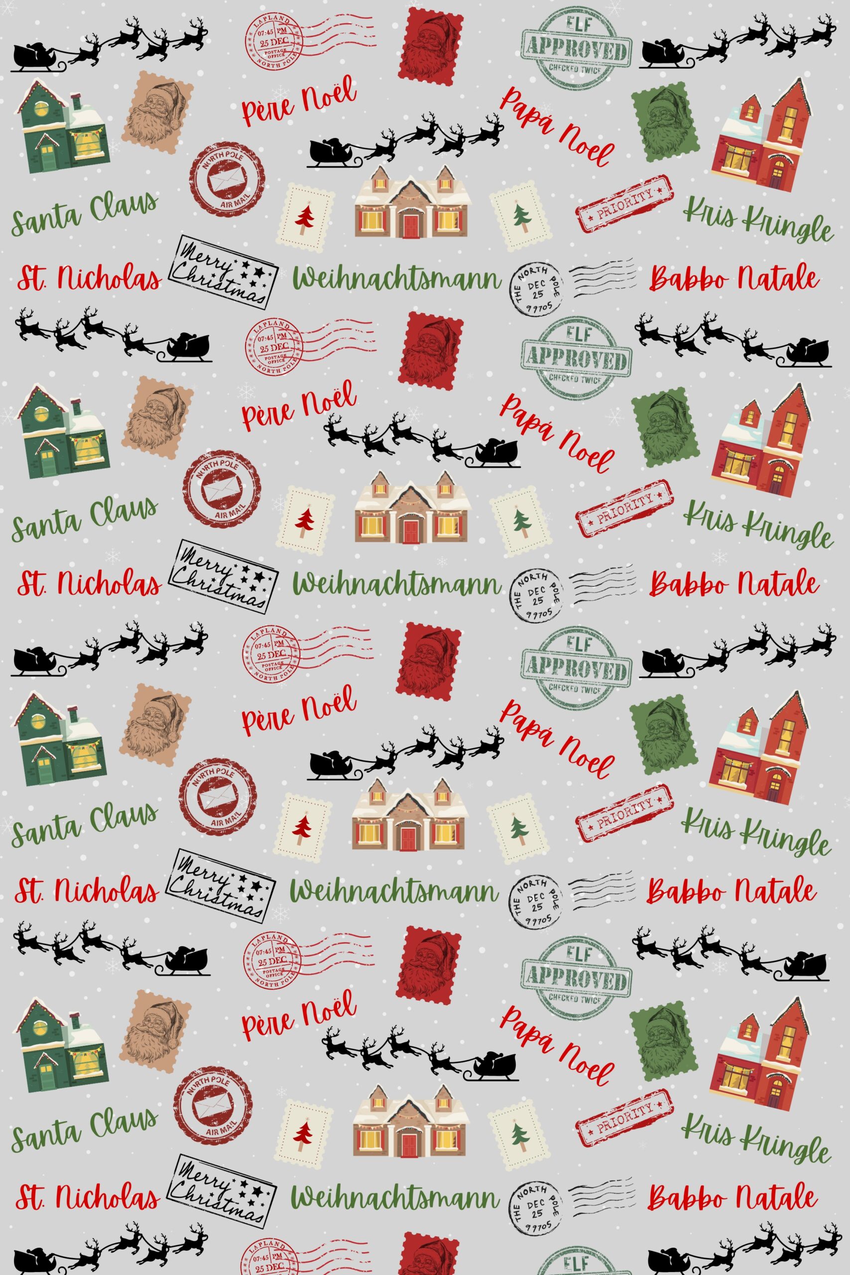 ‘Merry Christmas’ and Santa’s many names—St. Nicholas, Kris Kringle, Père Noël, Babbo Natale, and more—add a touch of global charm. It’s a timeless nod to Christmas nostalgia. Additionally, it is oversized 24×36, smooth, and semi-gloss/semi-matte. Thus, it folds and ties like a dream—special delivery guaranteed.